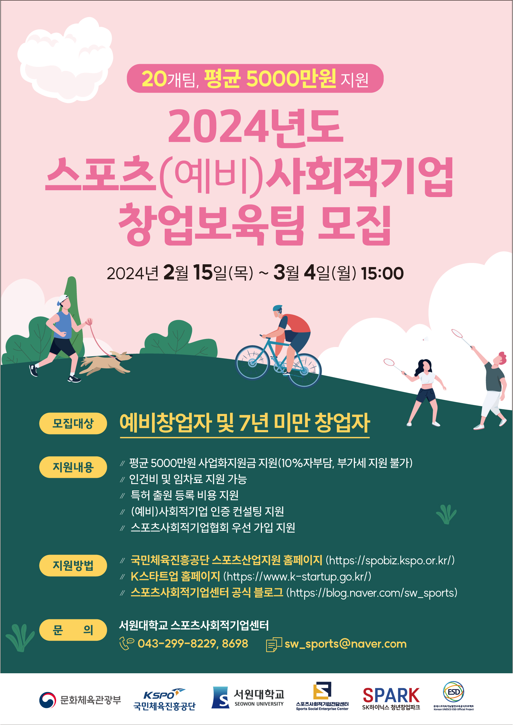[¼¿ø´ë ½ºÆ÷Ã÷»çȸÀû±â¾÷¼¾ÅÍ] º¸À°±â¾÷ ¸ðÁý °ø°íÀúÈñ ¼¾ÅÍ´Â ±¹¹ÎüÀ°ÁøÈï°ø´ÜÀÇ ½ºÆ÷Ã÷»ê¾÷ »çȸÀû±â¾÷ »ç¾÷À» ¿î¿µÇϰí ÀÖ½À´Ï´Ù.½ºÆ÷Ã÷»ê¾÷ ºÐ¾ß ¿¹ºñâ¾÷ÀÚ ¶Ç´Â ¾÷·Â 7³â ¹Ì¸¸ â¾÷±â¾÷À» ´ë»óÀ¸·Î Æò±Õ 500..