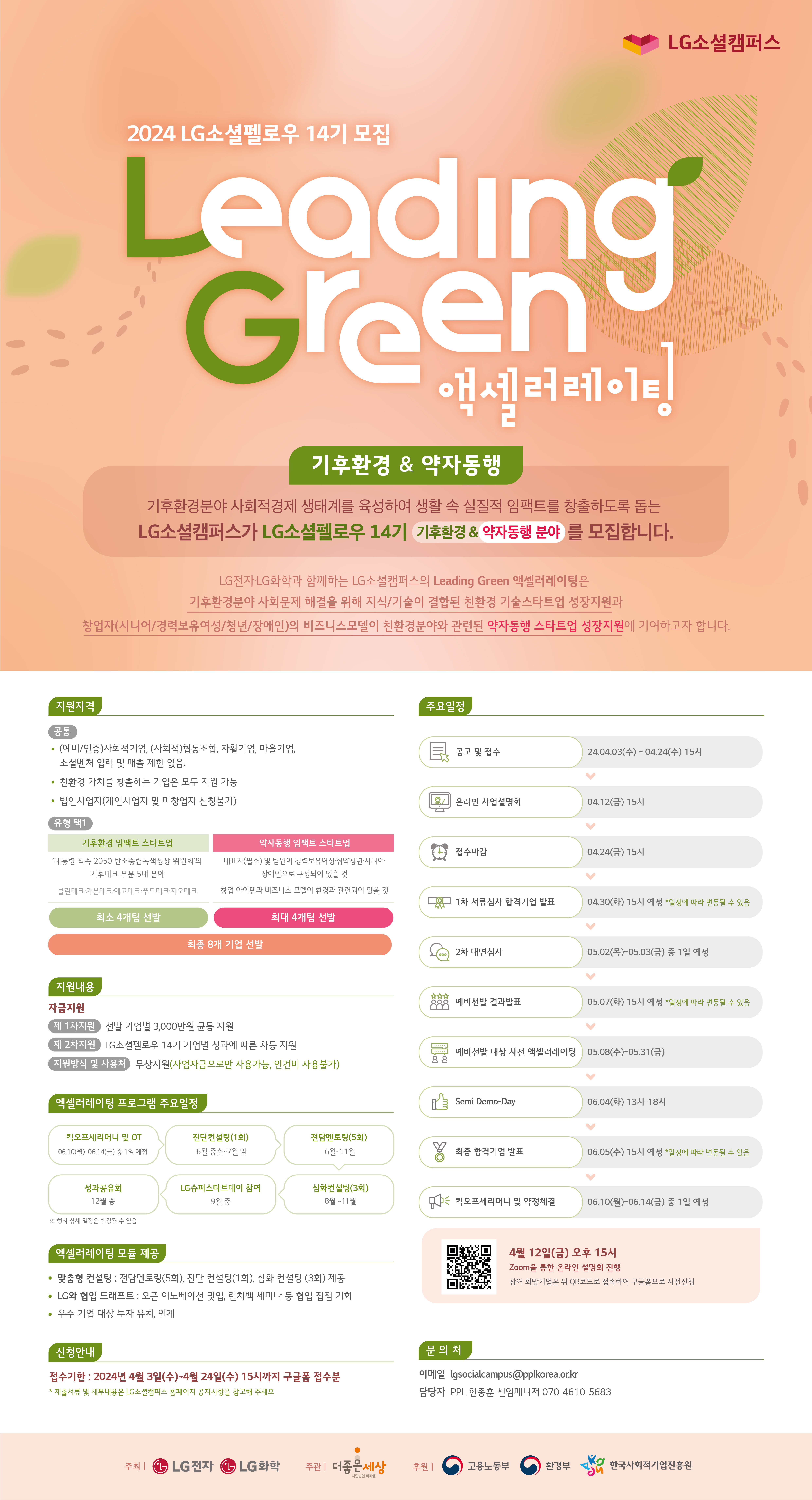 ¾È³çÇϼ¼¿ä LG¼Ò¼ÈÄ·ÆÛ½ºÀÔ´Ï´Ù.2024³â LG¼Ò¼ÈÄ·ÆÛ½º Leading Green Accelerating LG¼Ò¼ÈÆç·Î¿ì 14±â (±âÈÄȯ°æ&¾àÀÚµ¿Çà) ¸ðÁýÀ» ½ÃÀÛÇÕ´Ï´Ù. Áö¿ø³»¿ë - ½Åû ±â°£: '24.4.3(¼ö)~4.24(¼ö) 15½Ã ±îÁö- ¿Â¶óÀÎ »ç¾÷..