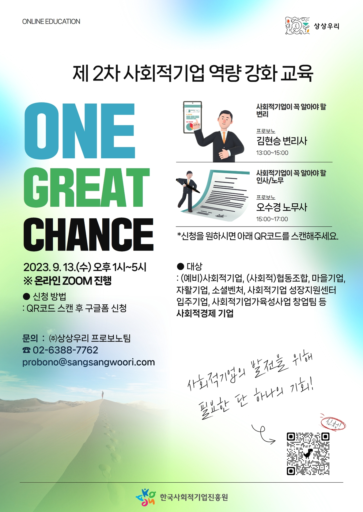 < Á¦ 2Â÷ »çȸÀû±â¾÷ ¿ª·® °È ±³À° >1. ±³À° ÀϽÃ: 9.13.(¼ö) 13:00~17:002. ÁøÇà ¹æ½Ä: ¿Â¶óÀÎ ZOOM(*±³À° ´çÀÏ ¿ÀÈÄ 12½Ã°æ ZOOM ¸µÅ© À̸ÞÀÏ ¹ß¼Û)3. ±³À° ³»¿ë 1±³½Ã - »çȸÀû±â¾÷ÀÌ ²À ¾Ë¾Æ¾ß ÇÒ º¯¸® (±èÇö..